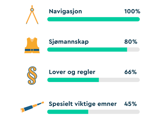 For å at du skal bestå båtførerprøven må du score 80% eller mer på hovedtemaet Spesielt viktige emner, i tillegg til minimum 80% totalscore, på båtførerprøven.